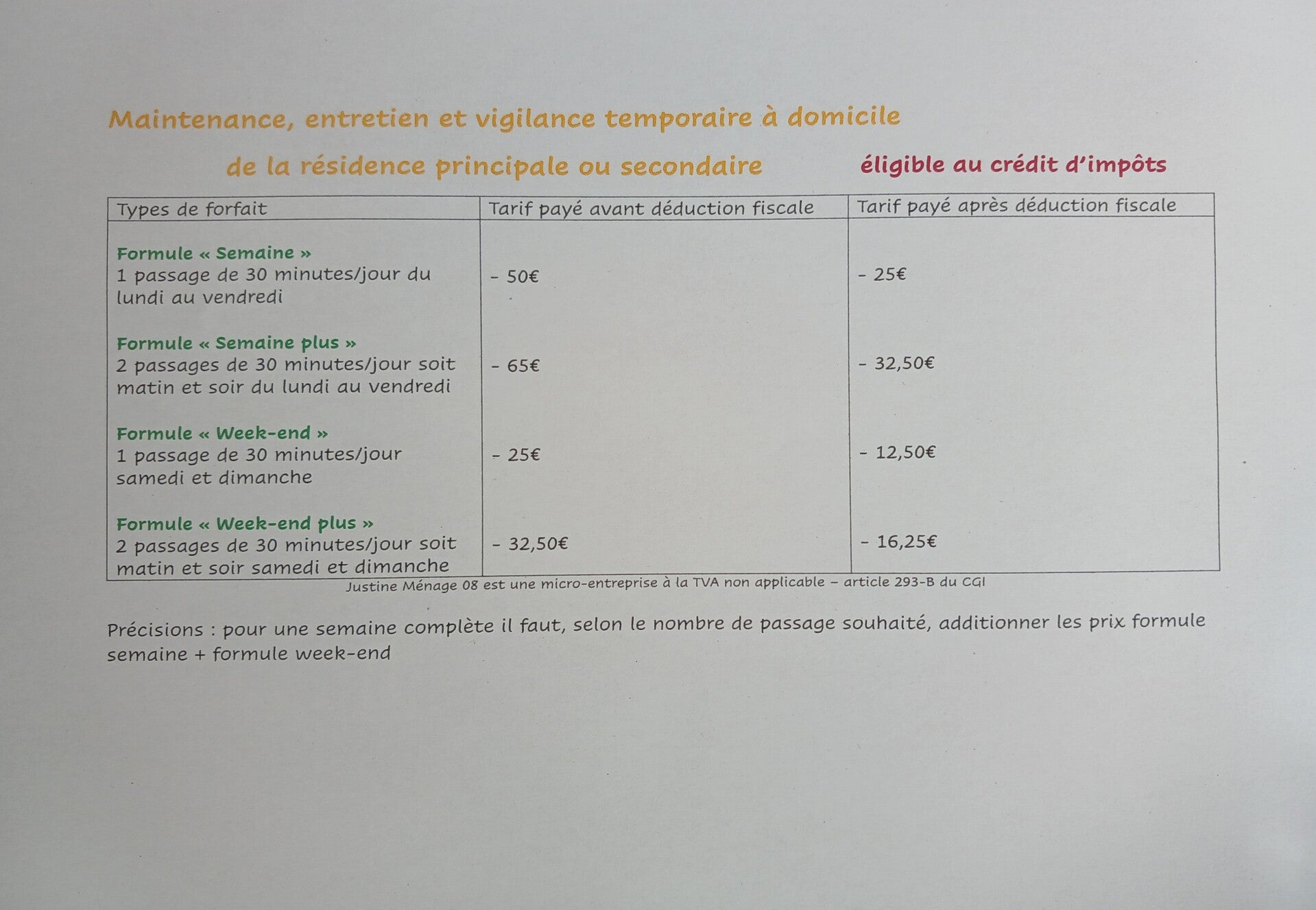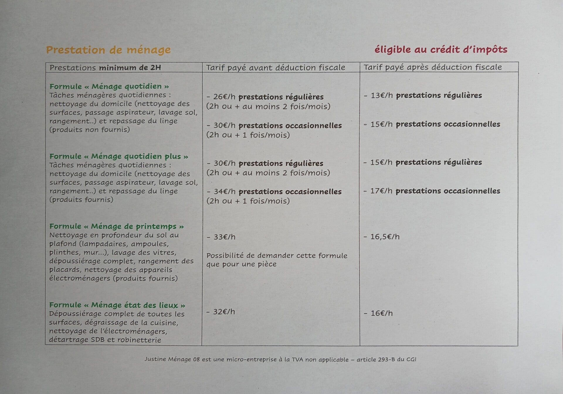 Dans le cas de Justine Ménage 08, le crédit d’impôt concerne les services de ménages, et le service de maintenance, entretien et vigilance temporaire du domicile. Étant considérée comme un organisme prestataire, Justine Ménage 08 vous fournira une attestation annuelle avant la fin du mois de mars de l’année suivant celle de la réalisation des prestations.